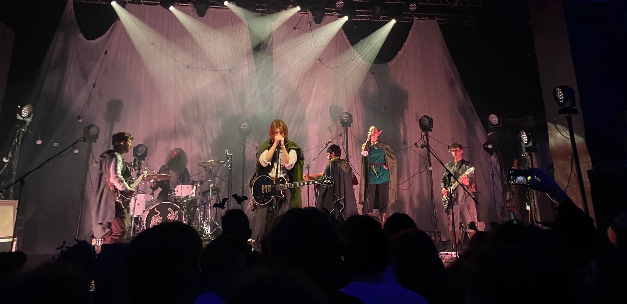 Support Balancing Act are no exception to the Halloween theme, emerging in black and gold marching band uniforms popularised in several music videos produced for My Chemical Romance’s The Black Parade. Although arguably wearing a more niche and unique costume than the staunchly book accurate Gandalf observing their set, the band seem to be siphoning My Chemical Romance’s pop-punk energy, assuredly performing songs from their recently released, and appropriately named for the spooky season, album: Who’ve You Come As? (Part 1). In spite of only recently forming in 2022, the band have swiftly found their feet, supporting not only The Amazons on their 21st Century Fiction tour, but also set to support Somebody’s Child and Bad Nerves later this year.