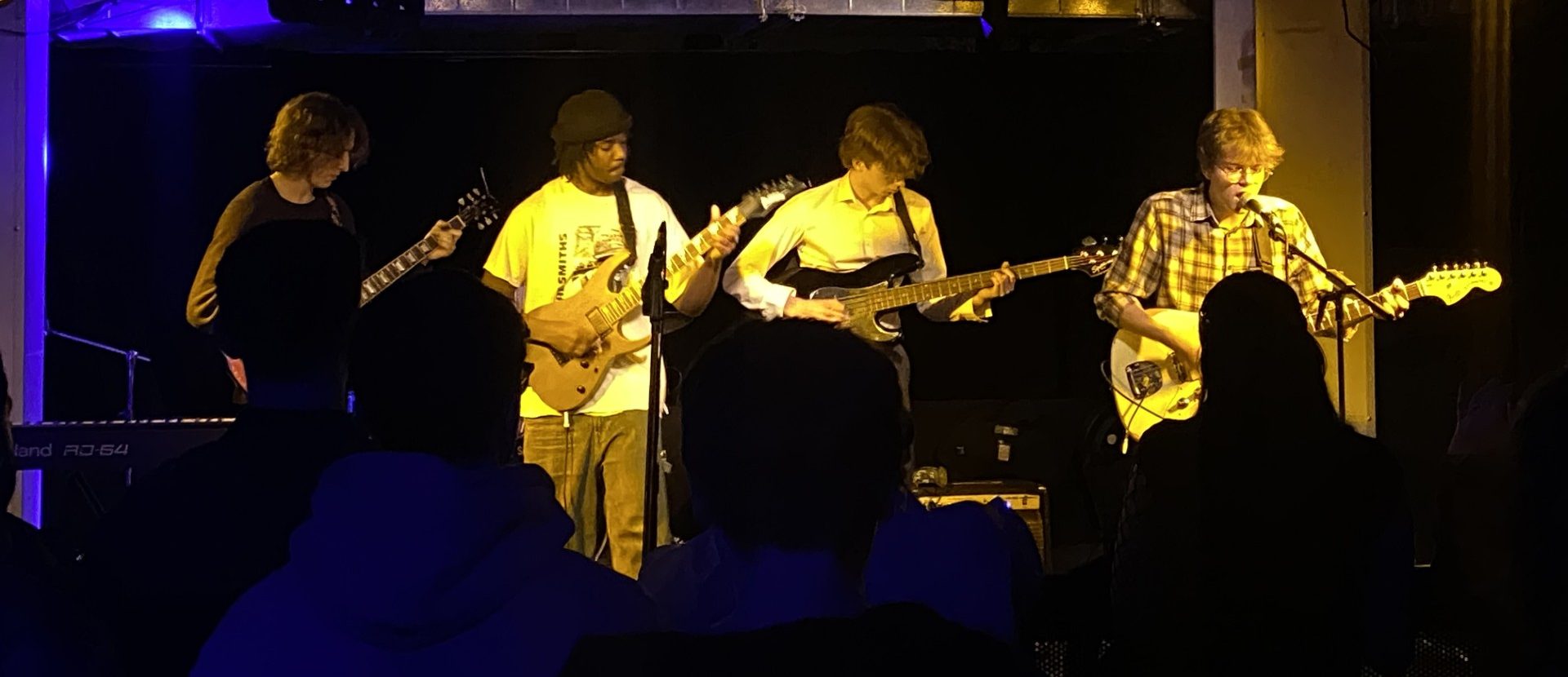 First up was The Boys Want Cars, initially consisting of four guitarists and a drummer, with the introduction of a saxophonist and keyboardist later on in their set. Brows furrowed in deep concentration, the band emitted sounds reminiscent of Billy Idol’s ‘Dancing With Myself’ and Pulp’s ‘Common People’. Originally starting as a project of home recordings, guitarist and vocalist Matt confides that BandSoc provided the perfect opportunity to bring his music to the stage, utilising his previous experience performing live. The band seem to have taken inspiration from a multitude of sources, such as 80s and 90s indie guitar pop, the likes of My Bloody Valentine and Teenage Fanclub receiving honourable mentions, as well as standouts from the 60s such as The Beatles and The Who. Matt claims that he intends for their music to be “pop-y but at the same time have a bigger soundscape”: a seemingly small band yet with big ambitions.