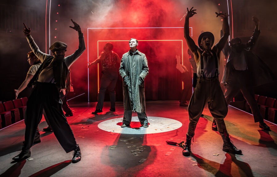 Scowling. Squinting. Decaying jowls. A reptilian, piano key smile. A dirty jacket and hat. In the prologue to the RSC’s production of The Resistible Rise of Arturo Ui, Mark Gatiss creeps into the titular role. His entrance, introduced in the middle of the prologue, comes as stark. Moments earlier, we were with Mawaan Rizman’s sardonic Barker, beginning the play with shrewd asides to the audience and jokes about comp tickets. The prologue’s end is also light hearted and bombastic; dollar bills flying into the air and Placebo’s techno-alt sound making the intimate Swan Theatre feel epic. Yet, in the heart of this most tongue-in-cheek of satires, Director Seán Linnen finds the real darkness that centres Brecht’s parable of Hitler.